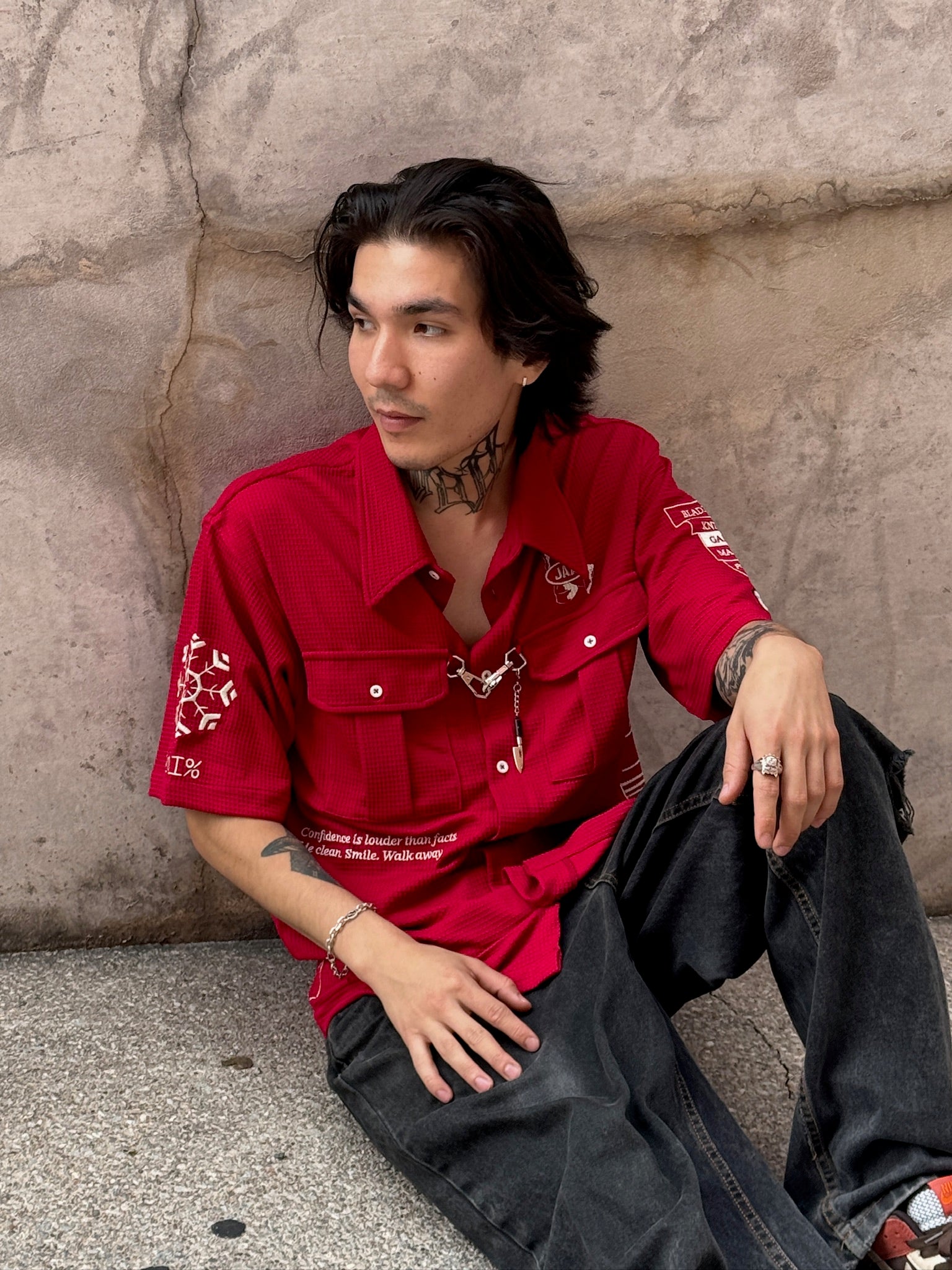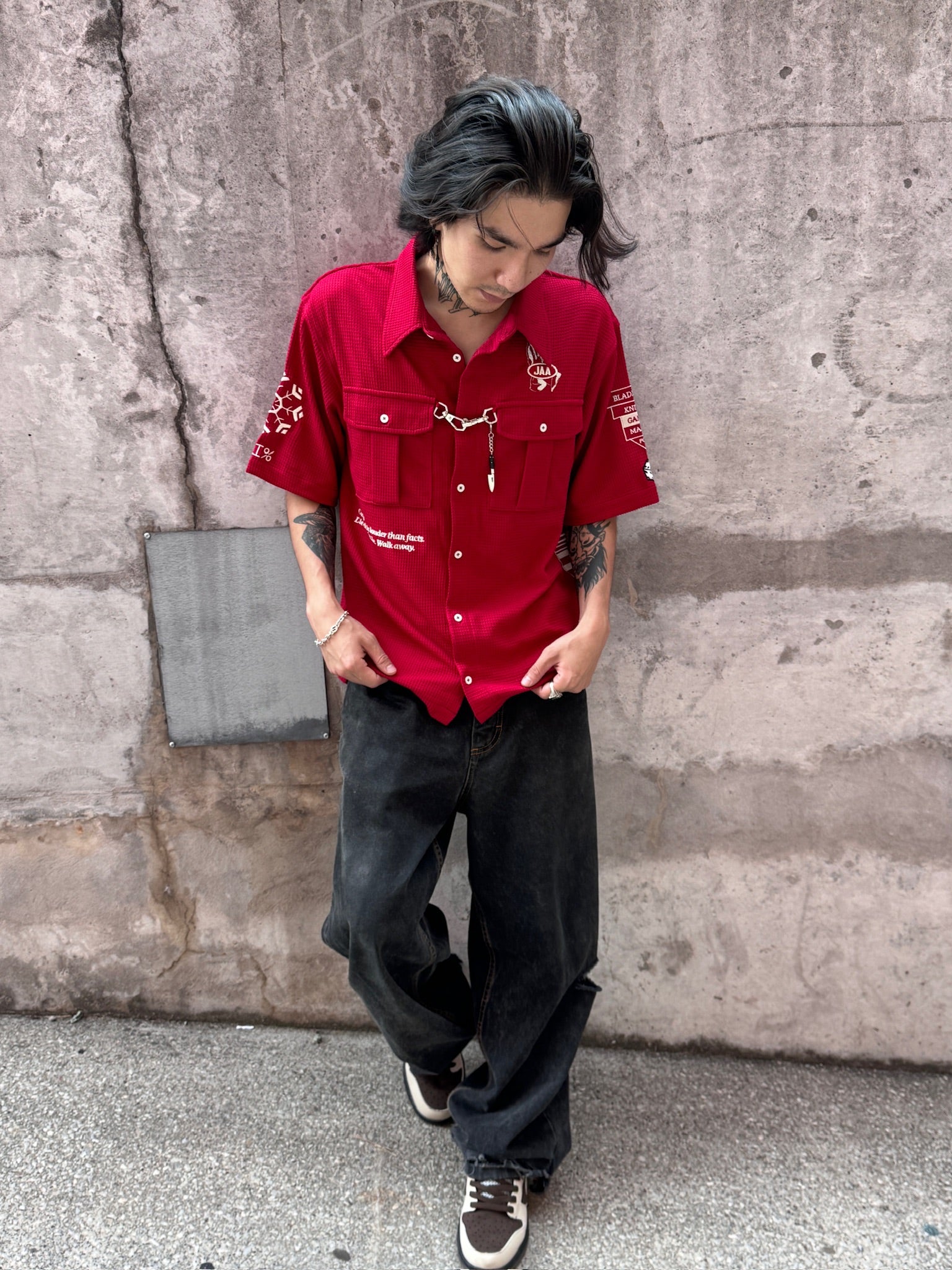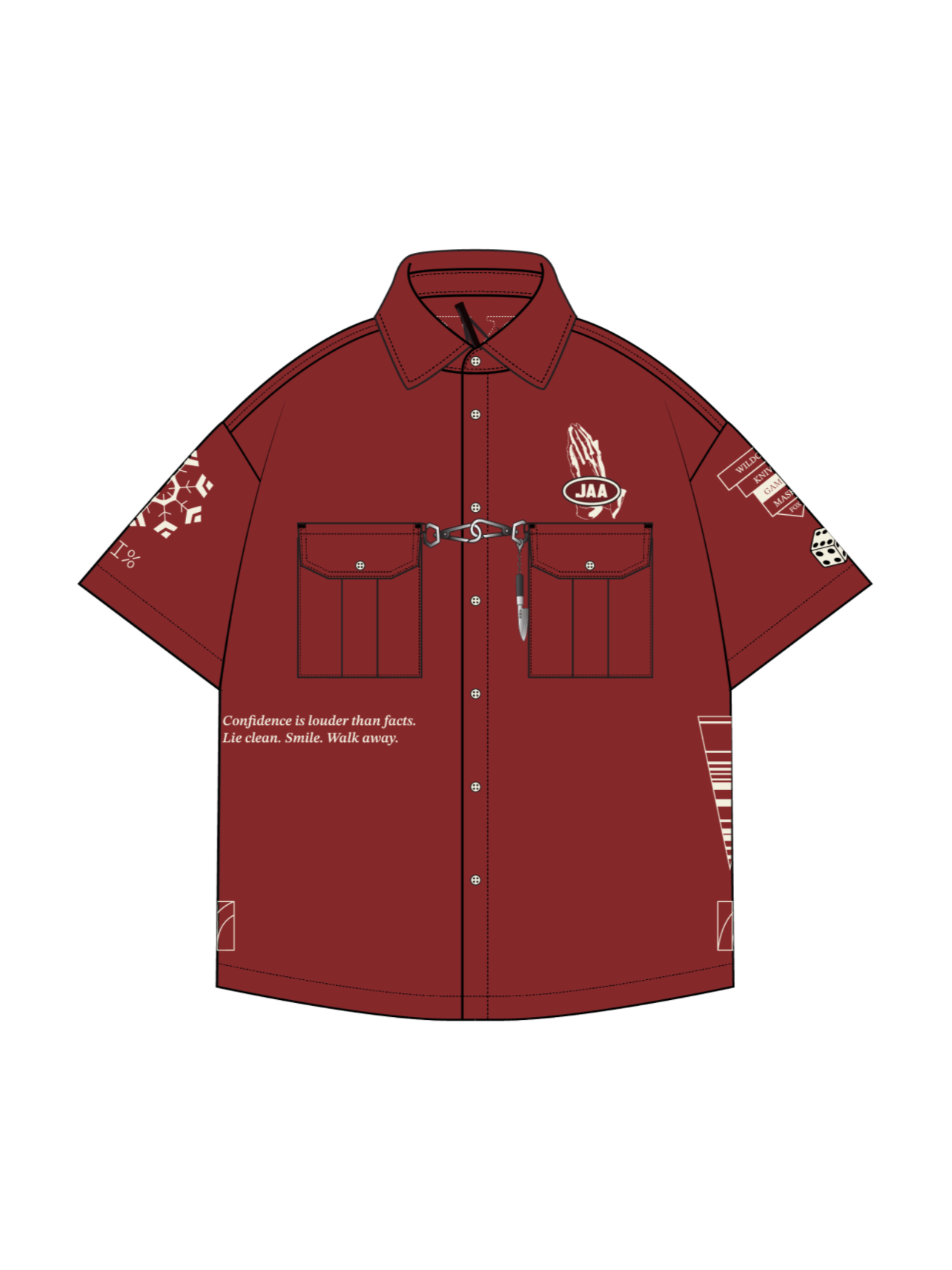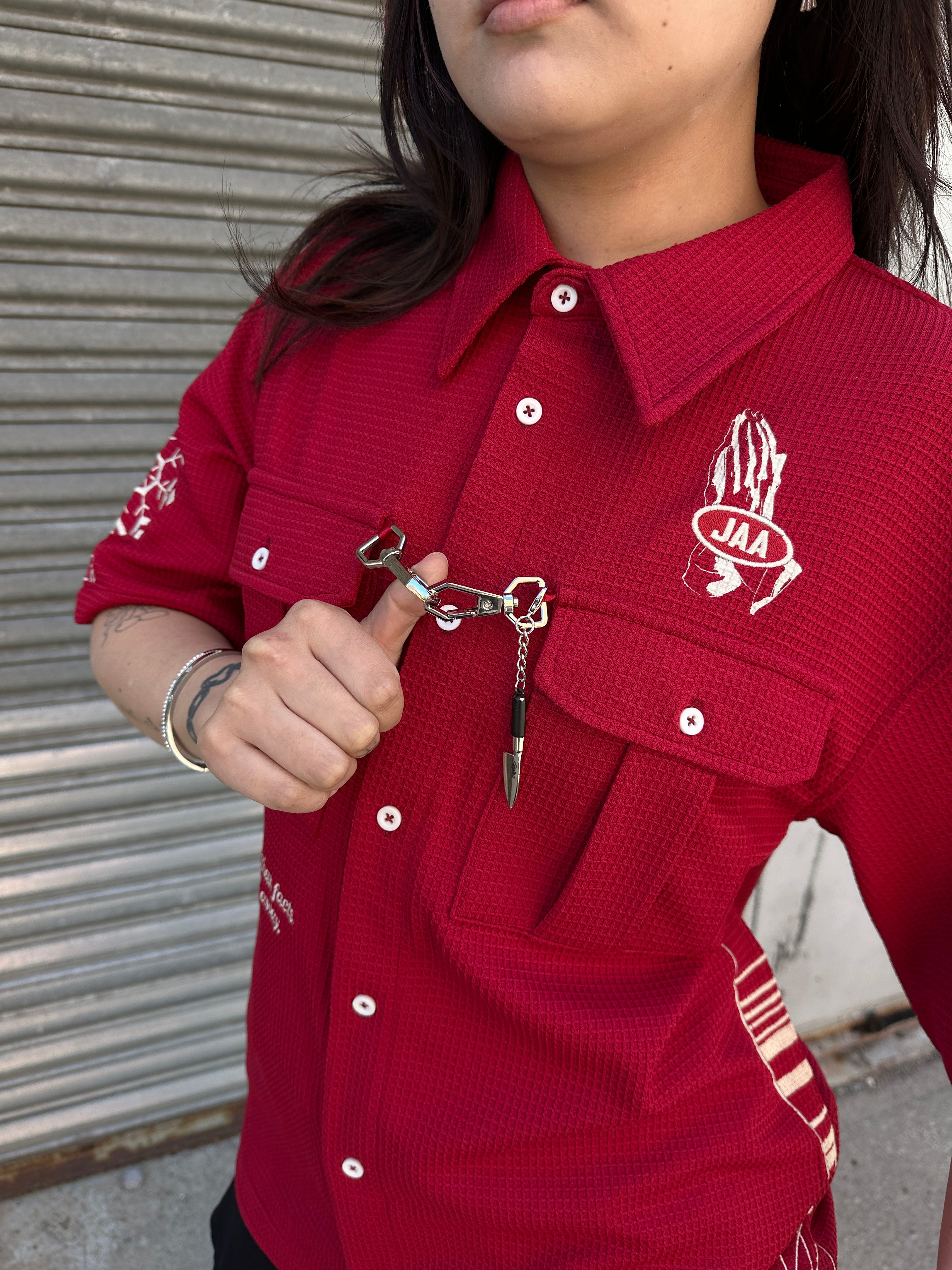 This button-up shirt is made of 100% Cotton material. We made all the designs with embroidery to ensure it is durable and not going to wash off! Metal hooks on the front of the shirt feature the knife reference. Very breathable and comfortable.