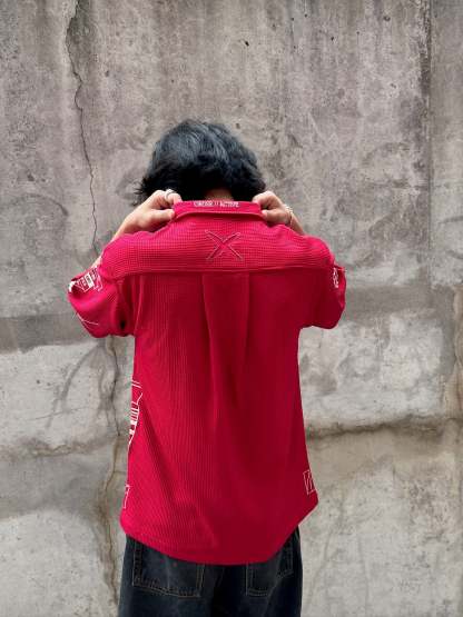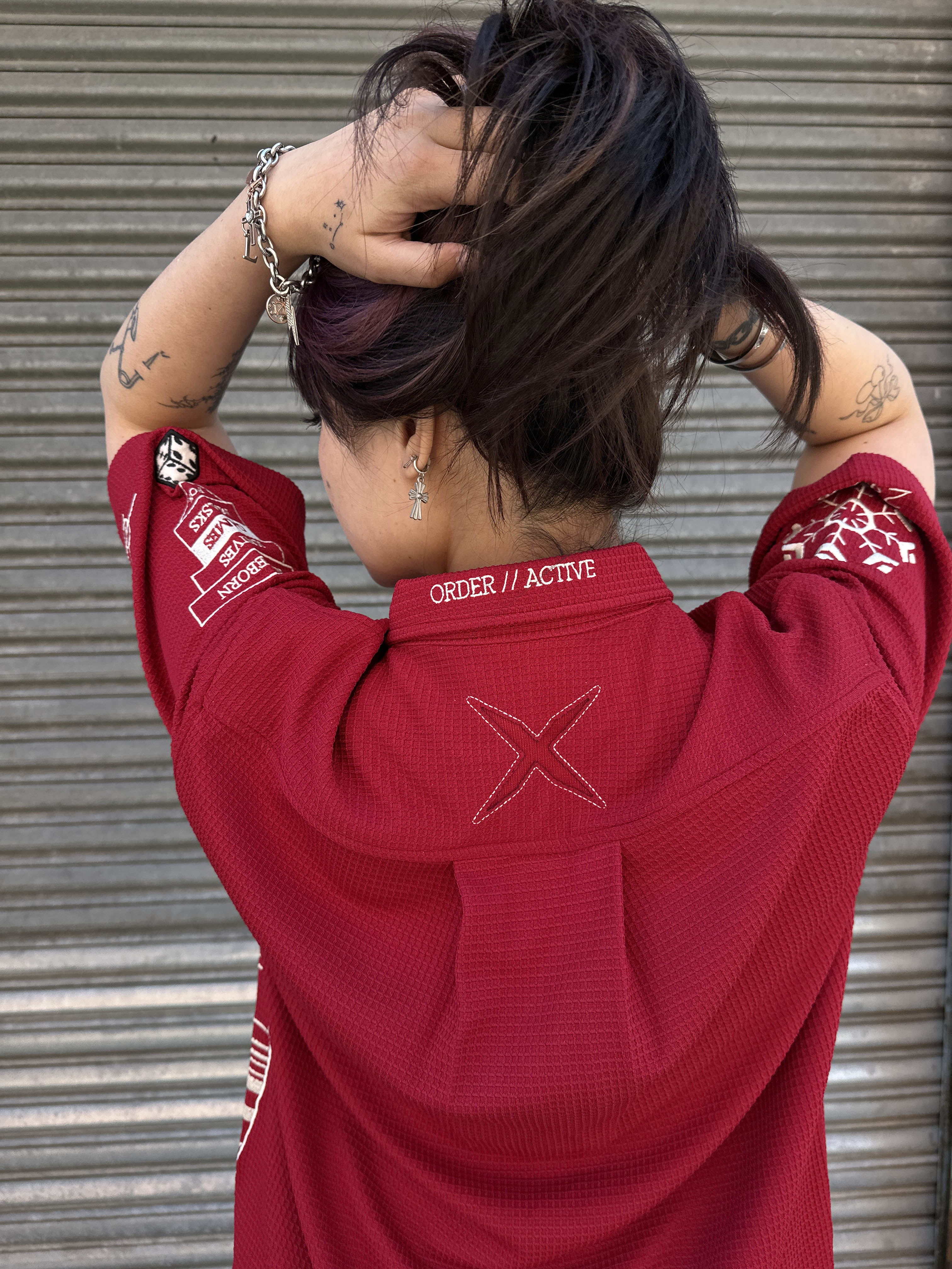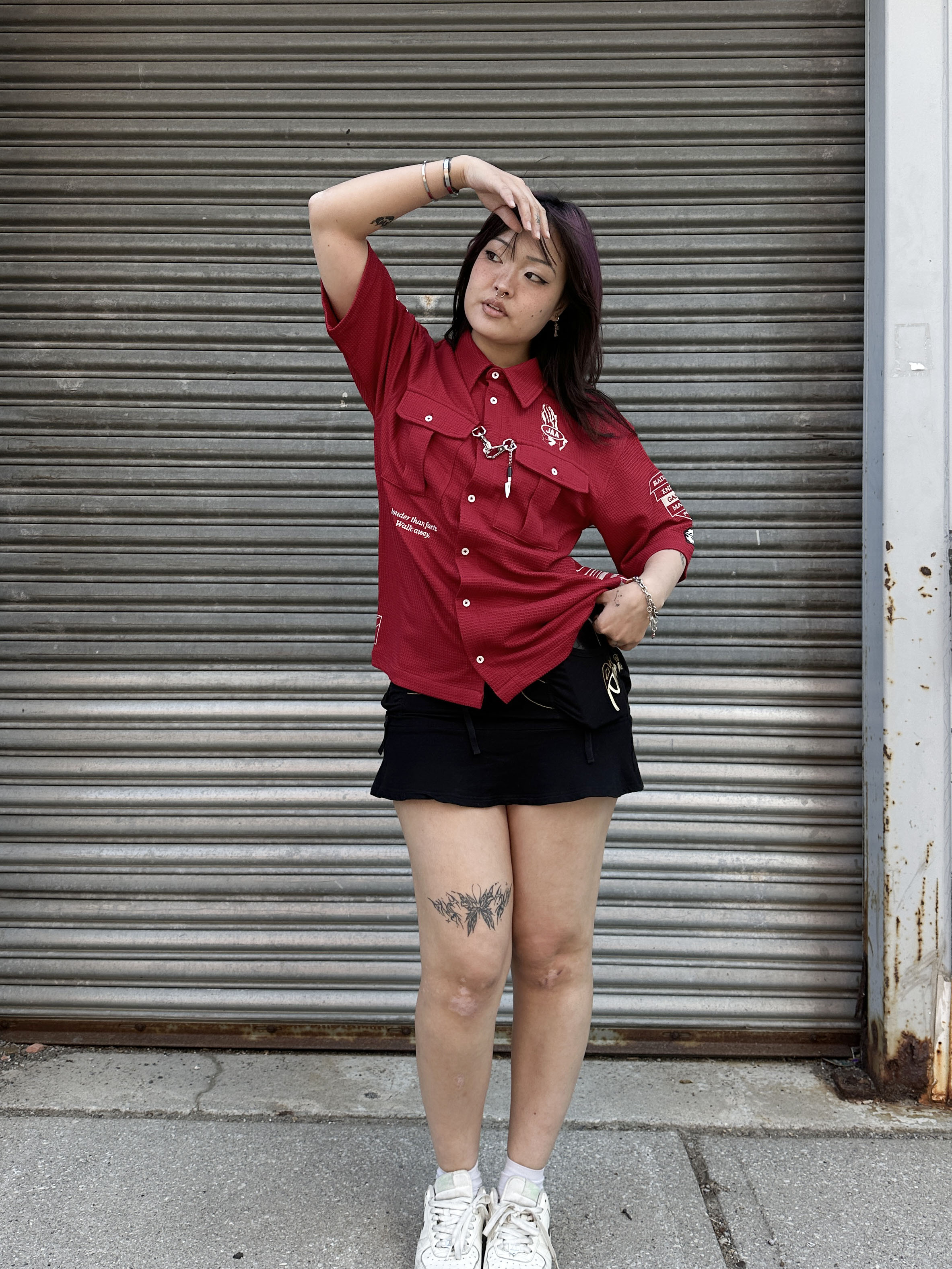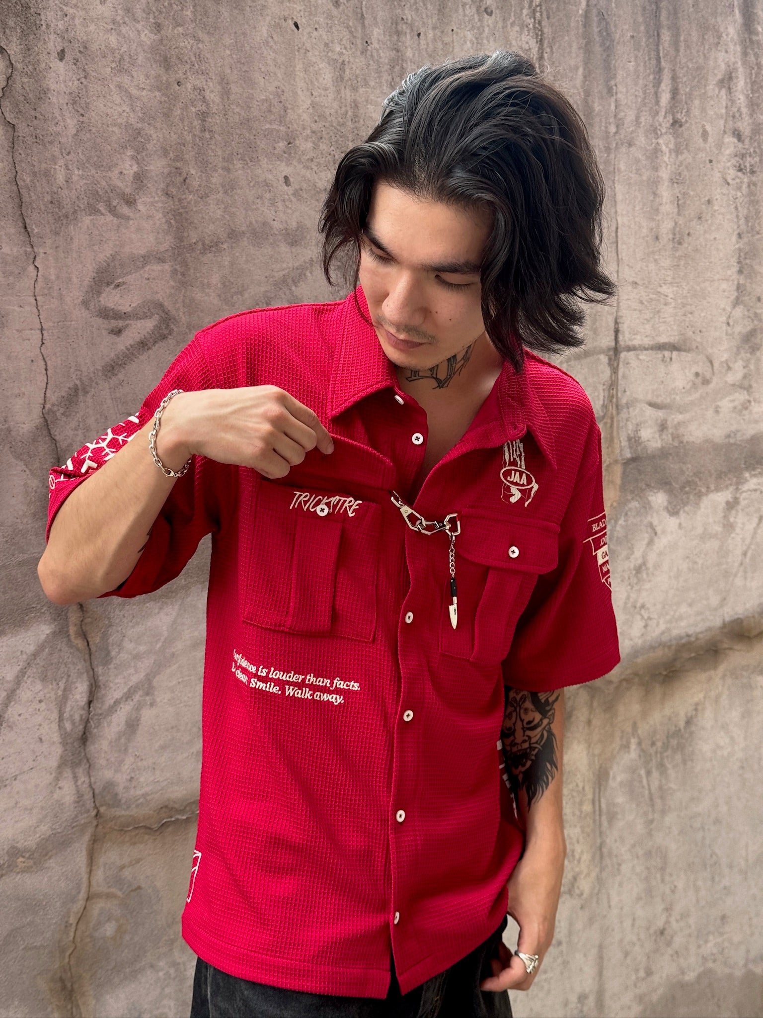 This button-up shirt is made of 100% Cotton material. We made all the designs with embroidery to ensure it is durable and not going to wash off! Metal hooks on the front of the shirt feature the knife reference. Very breathable and comfortable.