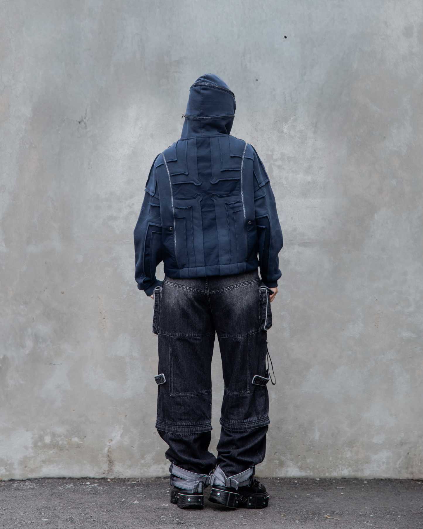 This hoodie is cut & sewn with mixed fabric textures (fleece + ripstop contrast) and raw-edged seams. Made from a 70% cotton / 30% polyester blend. Features a detachable face mask, chest lacing detail, and functional zippers on the hoodie and shoulders. Finished with a multi-layered front pocket, built-in belt, embroidery details, and a reflective print inside the kangaroo pocket.