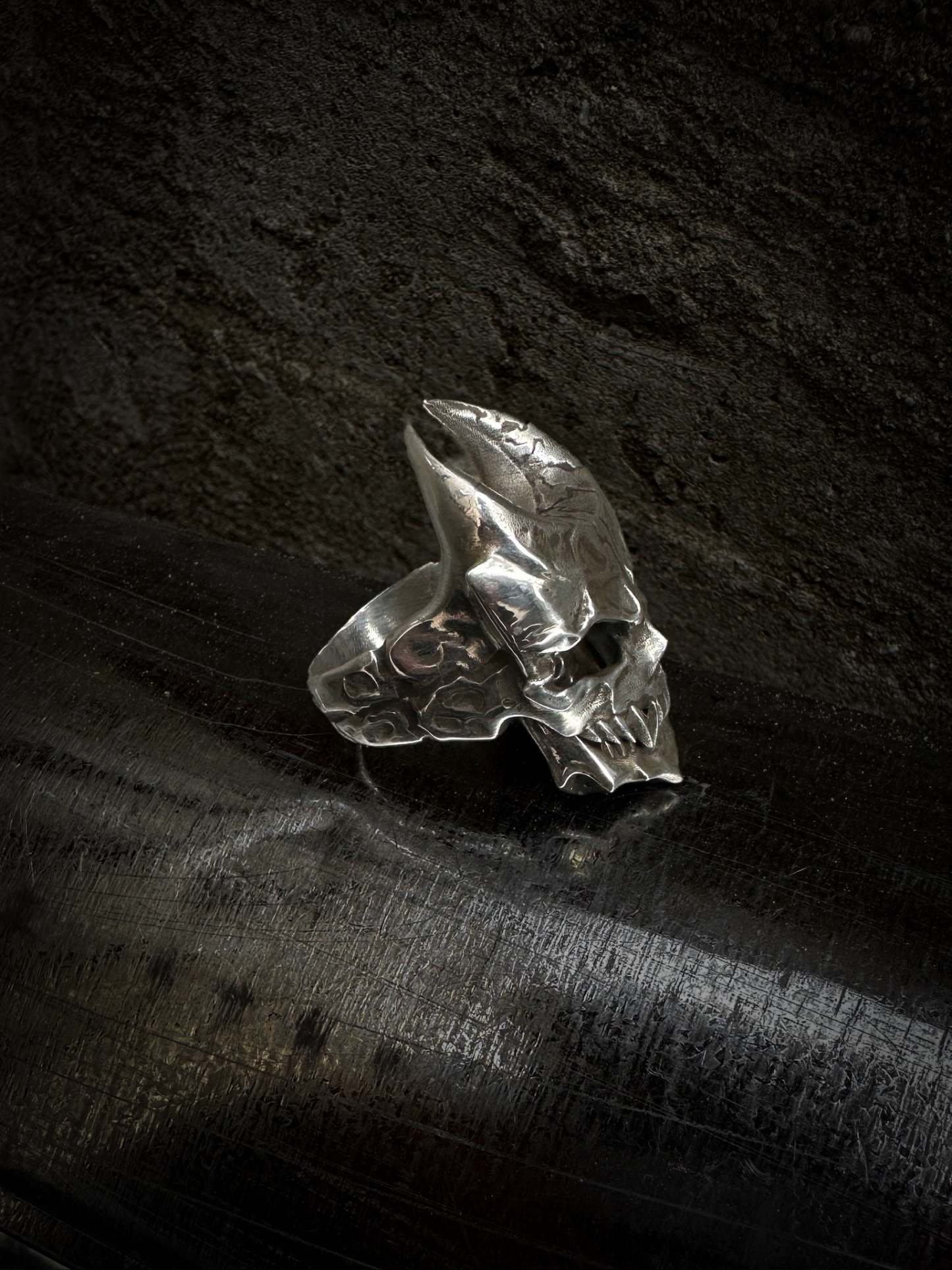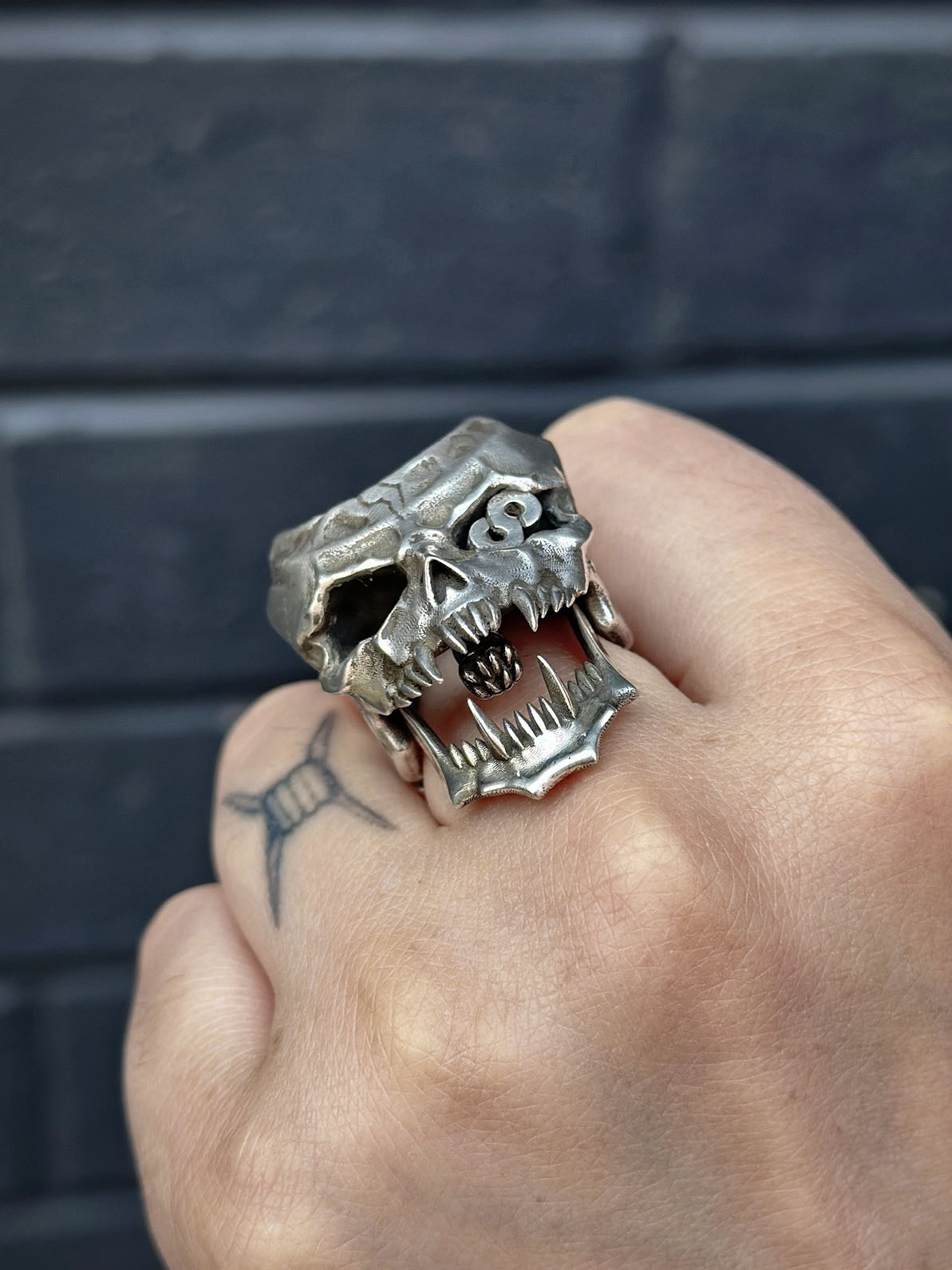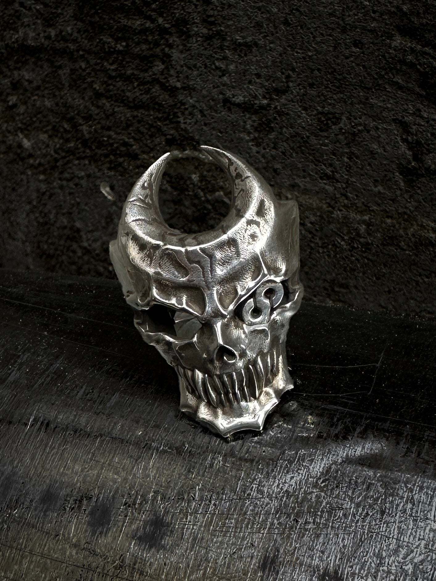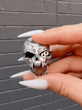 This ring is cast in stainless steel with a movable lower jaw design and a hidden worm. Made with a smooth, dark metal brushed finish, the ring is durable and functional.
