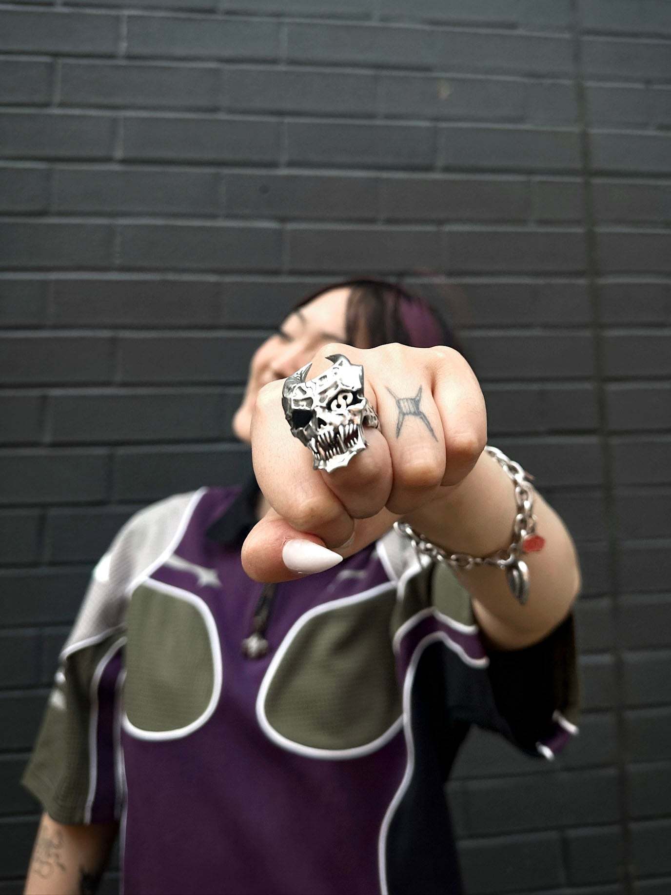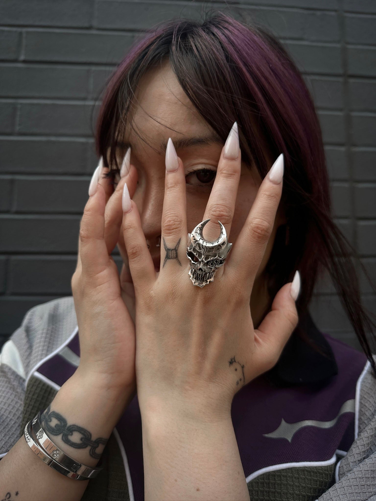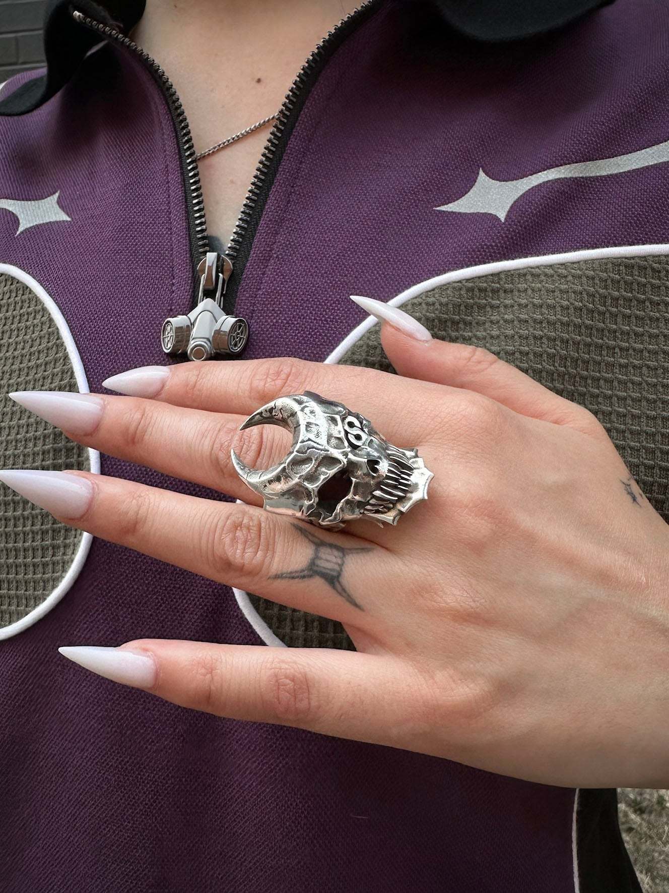 This ring is cast in stainless steel with a movable lower jaw design and a hidden worm. Made with a smooth, dark metal brushed finish, the ring is durable and functional.