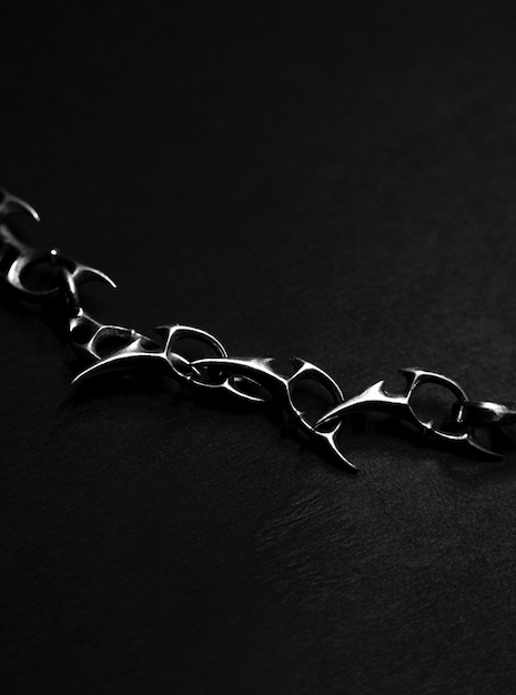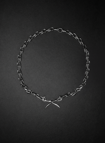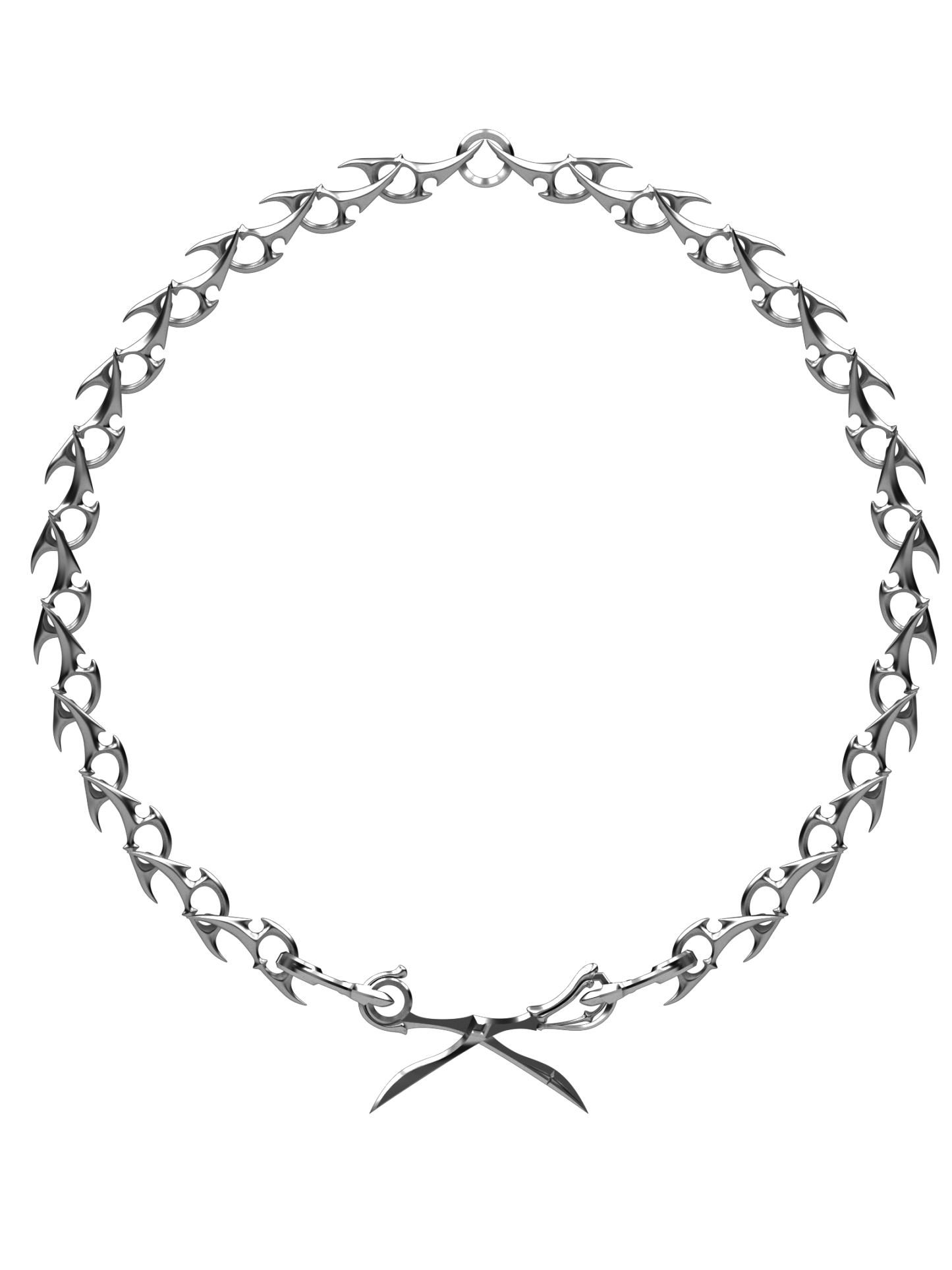 Anchored by a scissor-shaped pendant, sharp in form and symbolic in meaning. Slashed details cut through the design, intersected by watchful eye motifs that feel intentional rather than decorative. The scissors remain fixed in place, suspended mid-motion, capturing a moment of tension rather than action. Designed to sit heavy at the center, the piece balances aggression and control. Subtle at a glance, unmistakable up close.