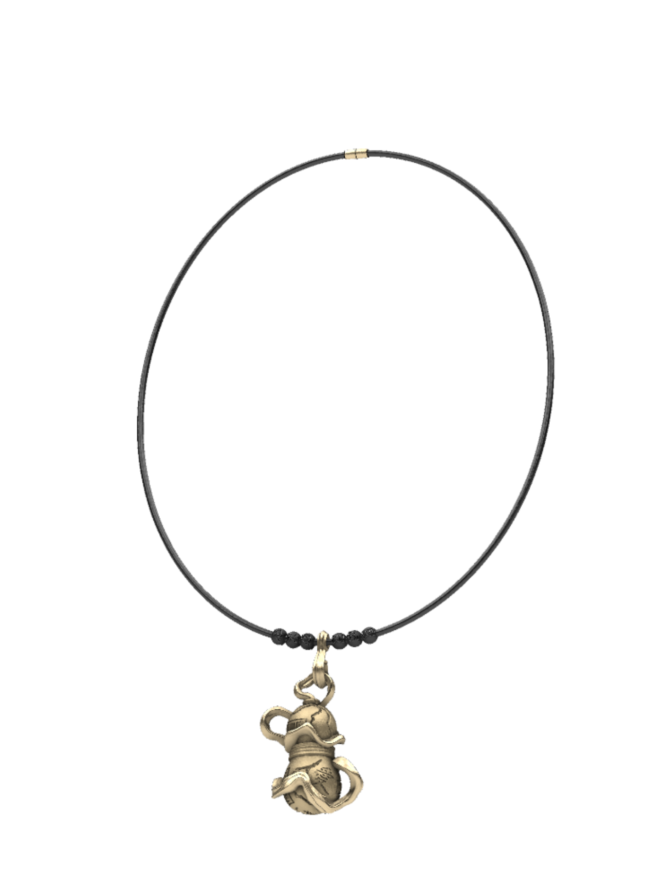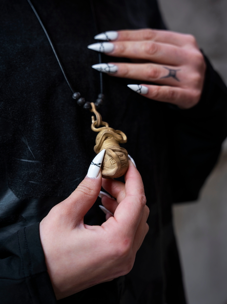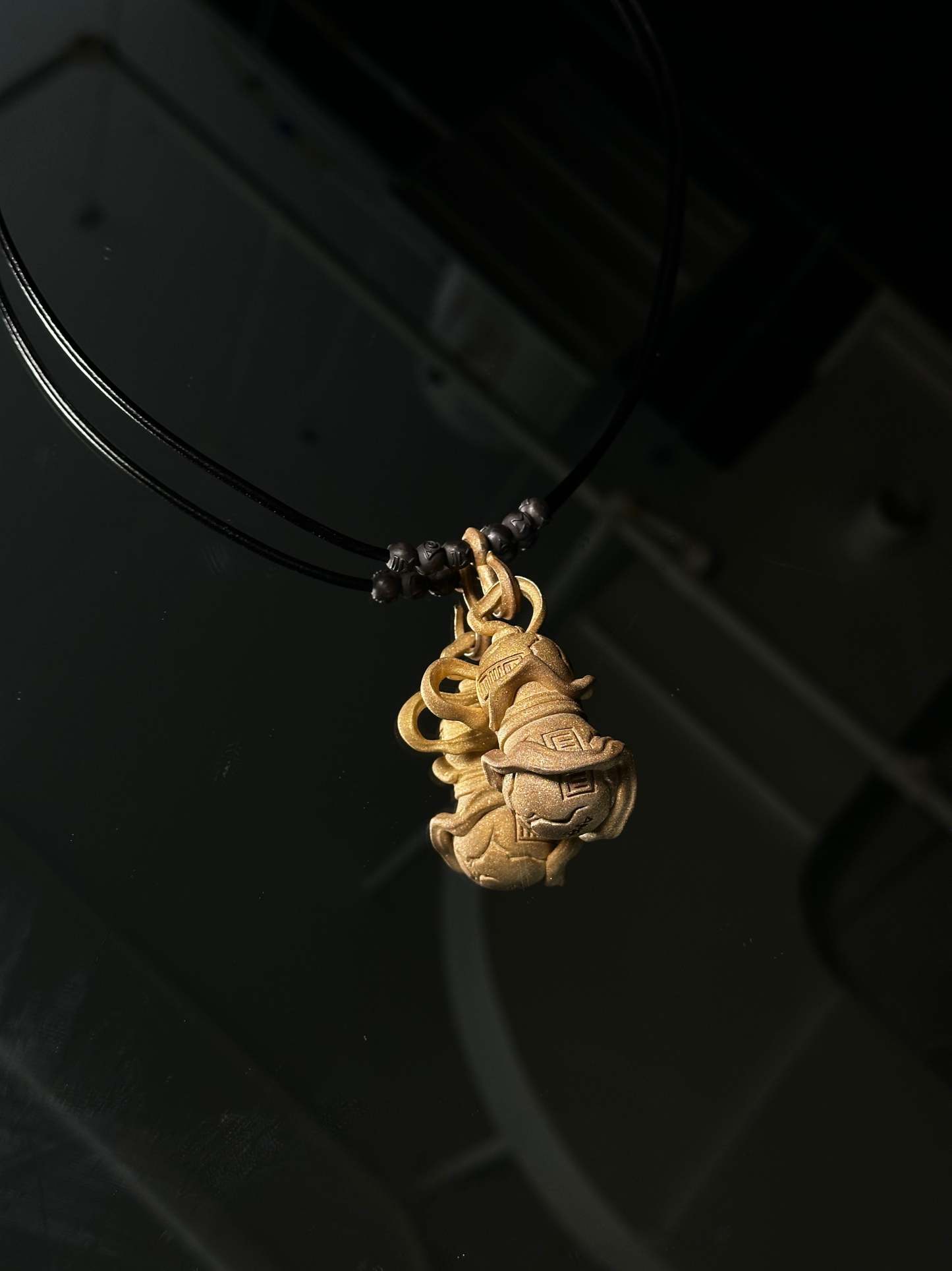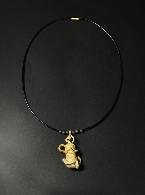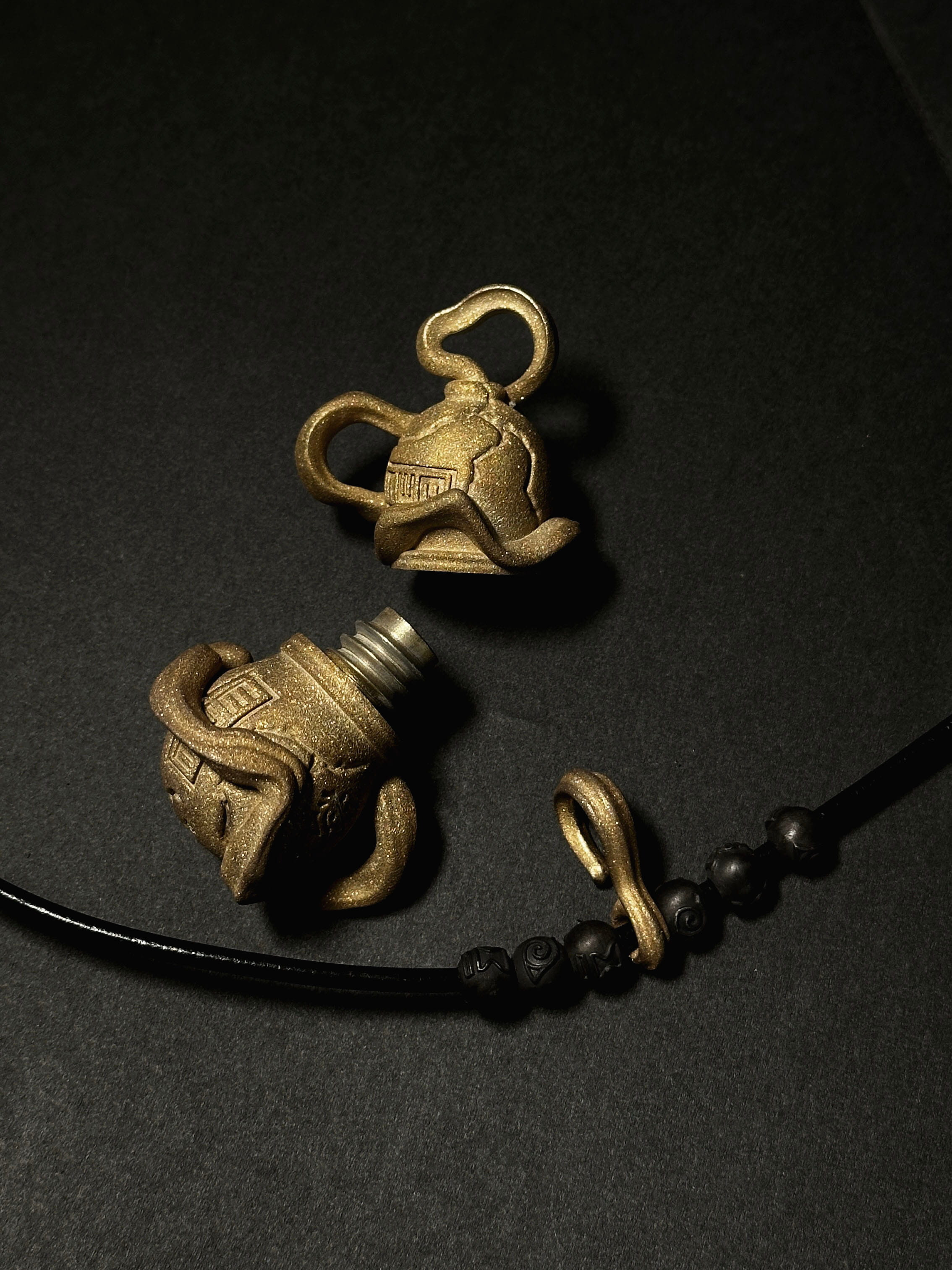 A sealed gourd pendant marked by engraved cracks and symbolic detailing, as if shaped by pressure rather than design. The form opens at the center, revealing layered elements within, while sand-like textures and erosion effects move across the surface. Beaded accents feature embossed symbols that add rhythm and contrast, grounding the piece with weight and repetition.