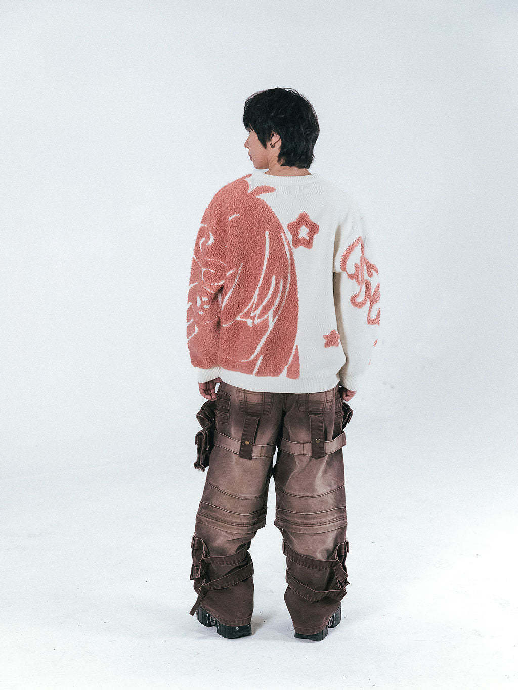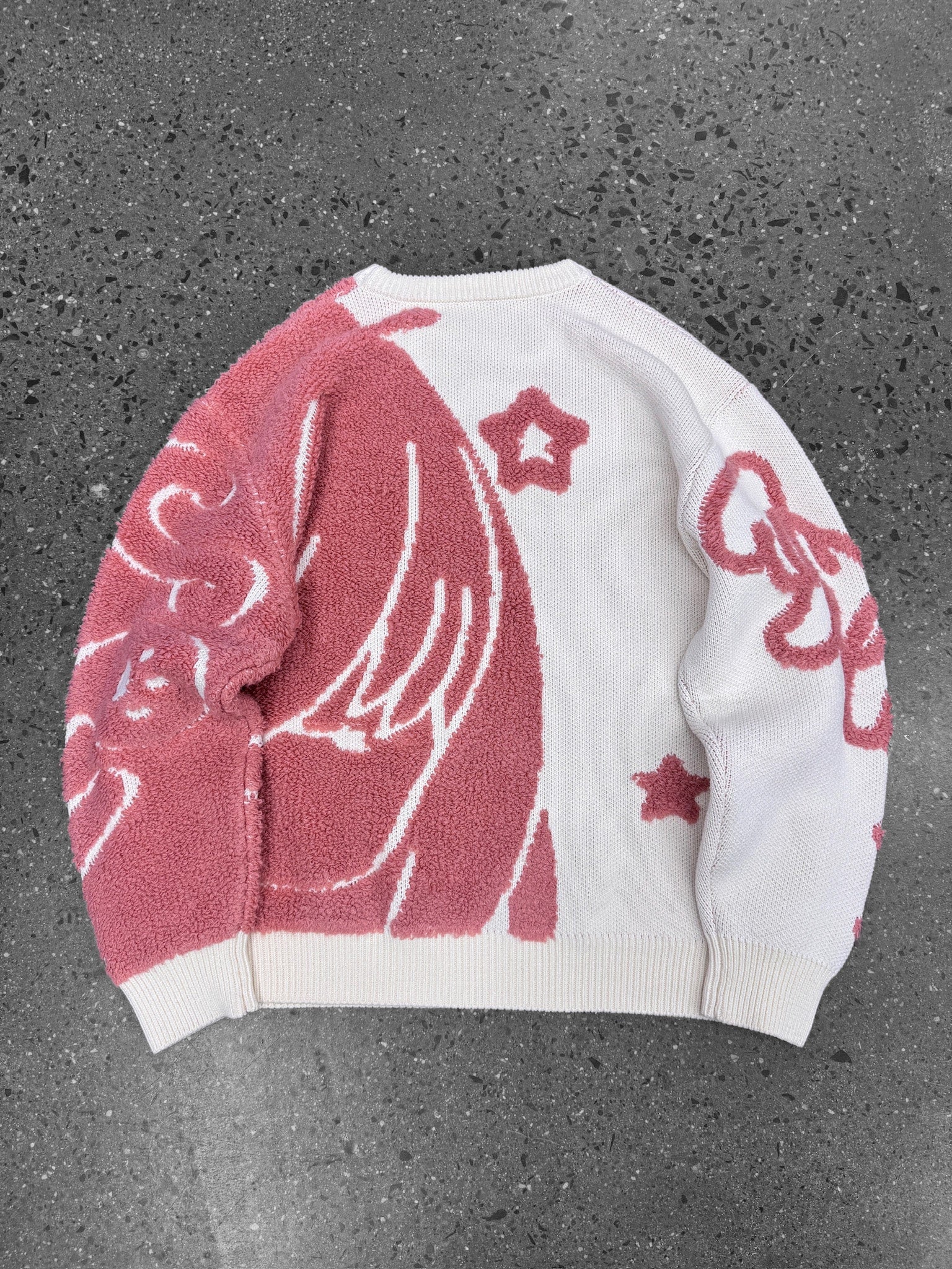 This knitted sweater is made from 100% soft cotton with a towel-texture knit for a comfortable, breathable feel. Features design elements on the front, back and sleeves.