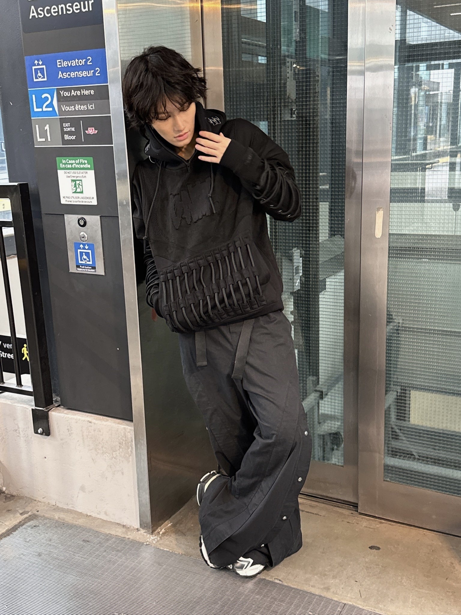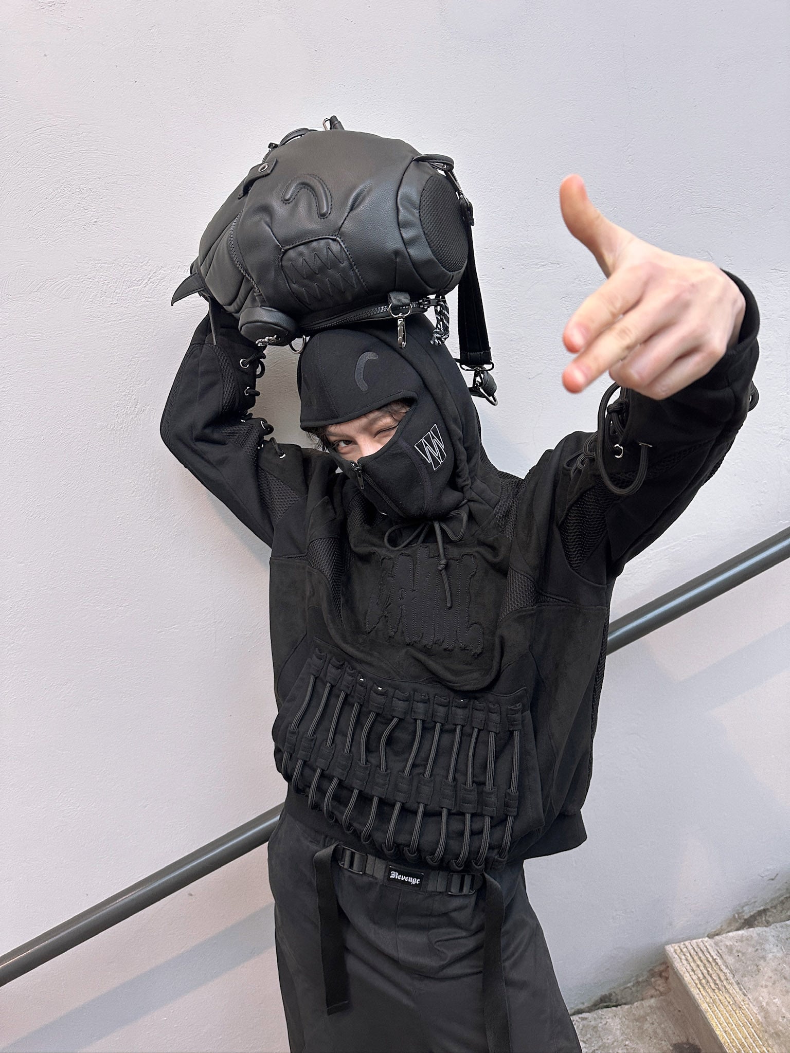 It features a built-in neoprene mask integrated into the hood, thick cords along the sleeves and back that add layered dimension, and a front kangaroo pocket with heavy cords. The design is finished with a chest “BANG” applique, and all the details of the hoodie are made to withstand long-term wear and maintain its structure over time.
