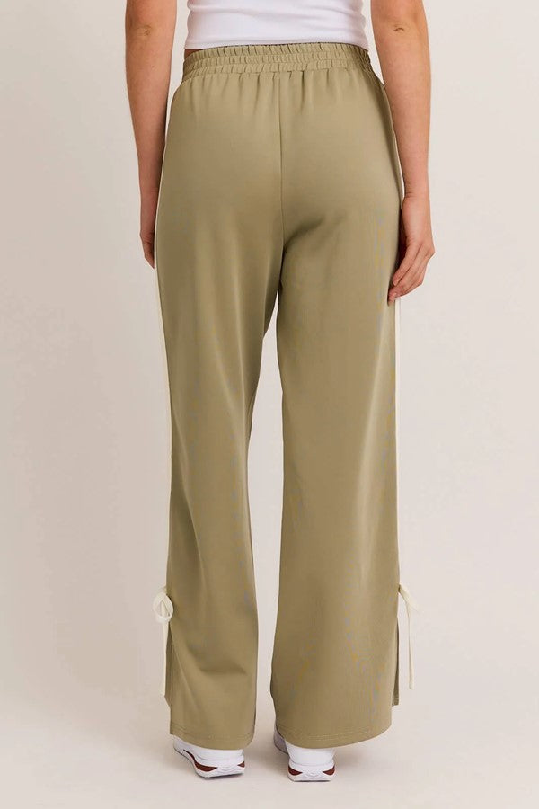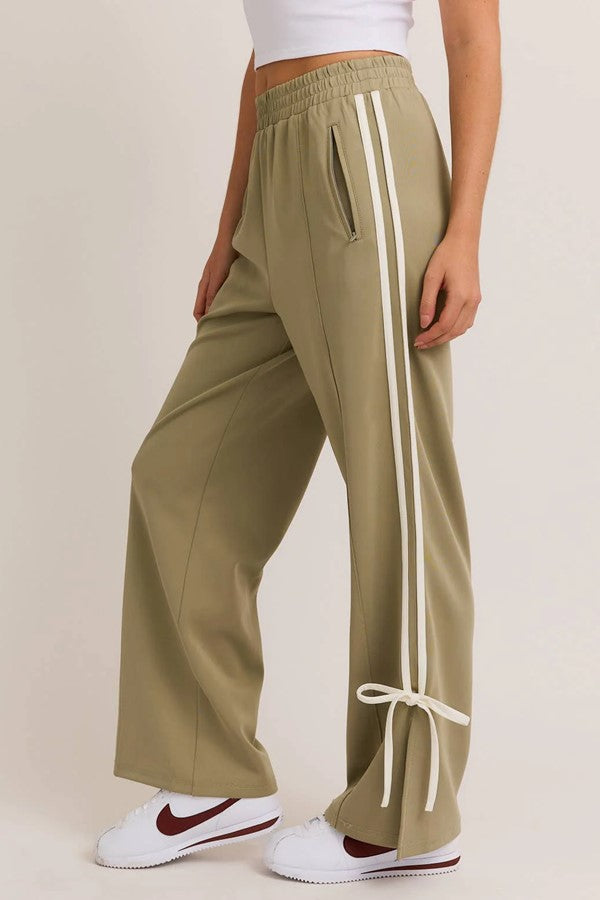 Hey Babe, Be the center of attention in the Bow Track Pants! These trendy track pants boast a playful bow detail on the side and come in two must-have colors: sage green with white detail. Elevate your athleisure game with a touch of playful charm.