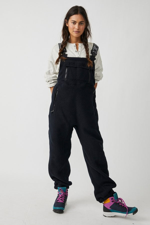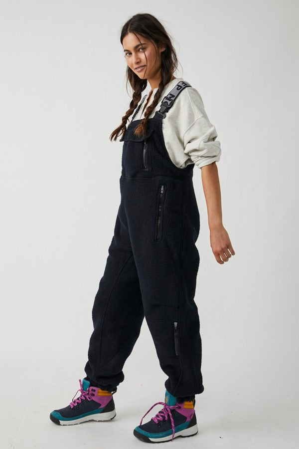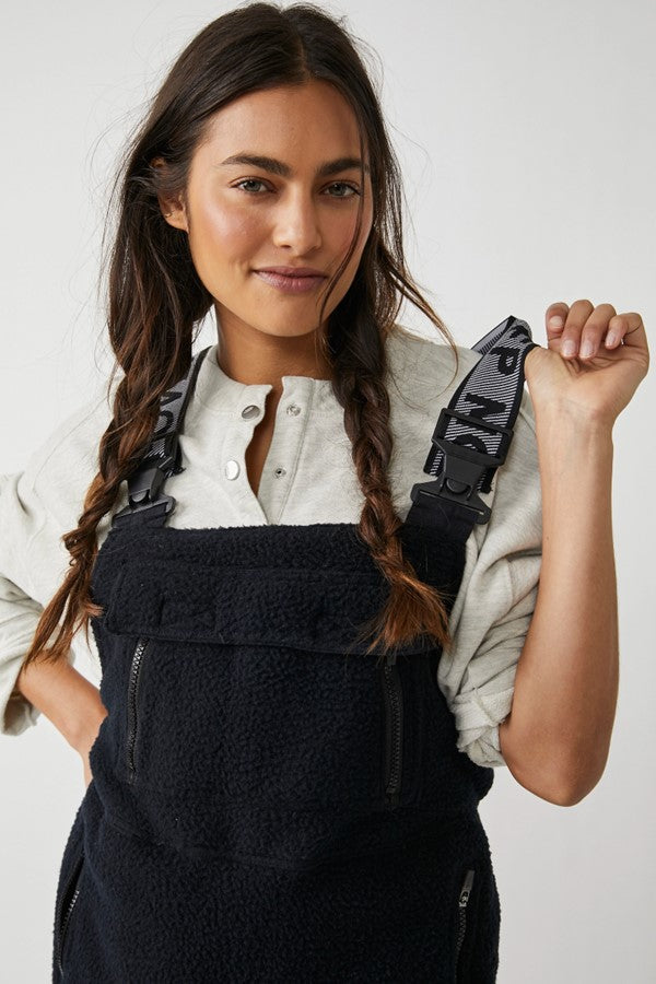 Features: Soft fleece fabrication, adjustable suspender straps with logo detailing, front zippered pouch pocket, zippered pockets on legs, salopette style