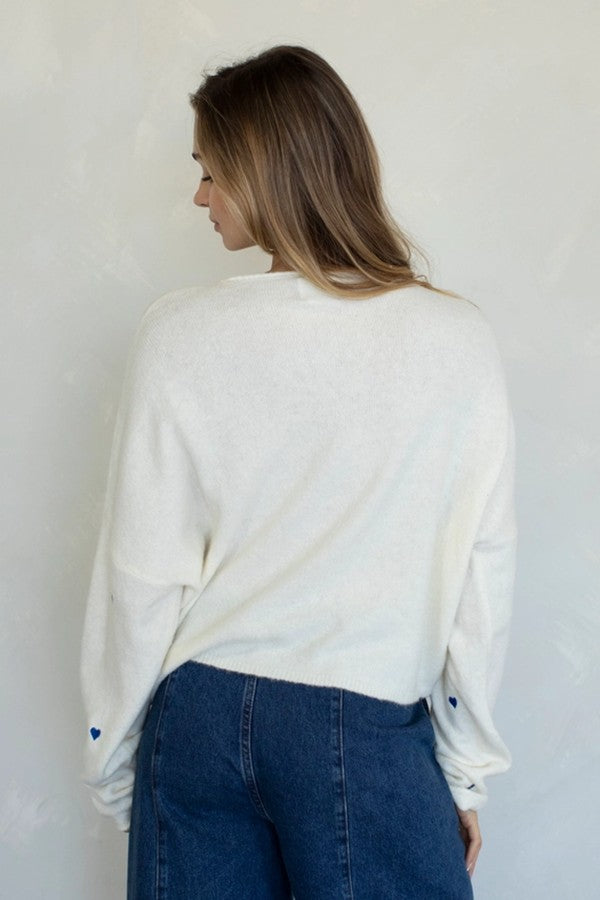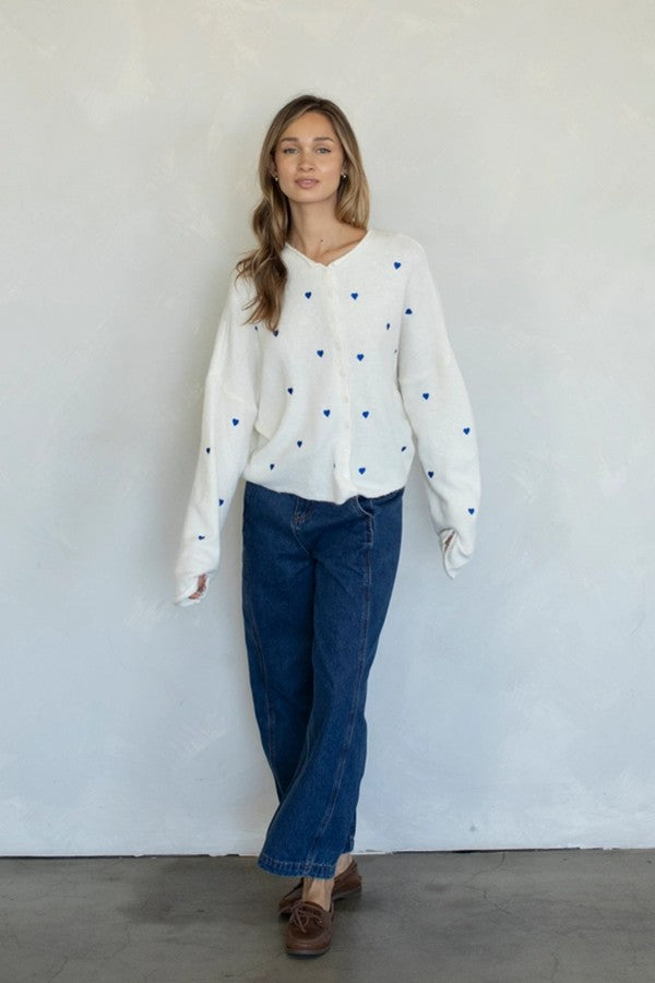 Hey Babe, Wrap yourself in effortless comfort with this cute little hearts cardigan—perfectly lightweight yet wonderfully soft. Charming rolled edges frame the sleeves and collar for a polished, laid-back vibe that works with everything in your closet.